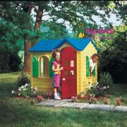 Features child-sized door, two sets of working shutters, built-in play table with balcony styling and storage pockets on interior walls.